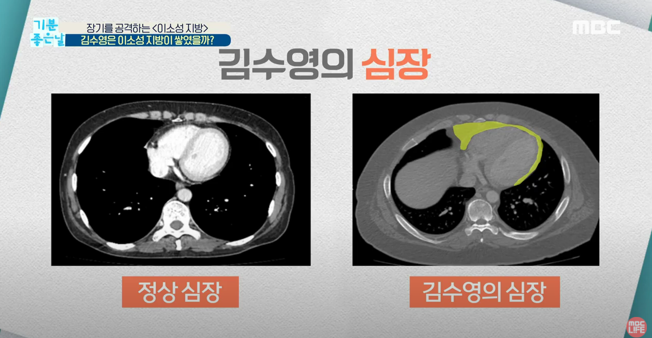 검사 결과 정상인 사람에 비해서 김수영 씨의 심장은 3.5cm 이소성 지방이 껴있는 것으로 나타났습니다.