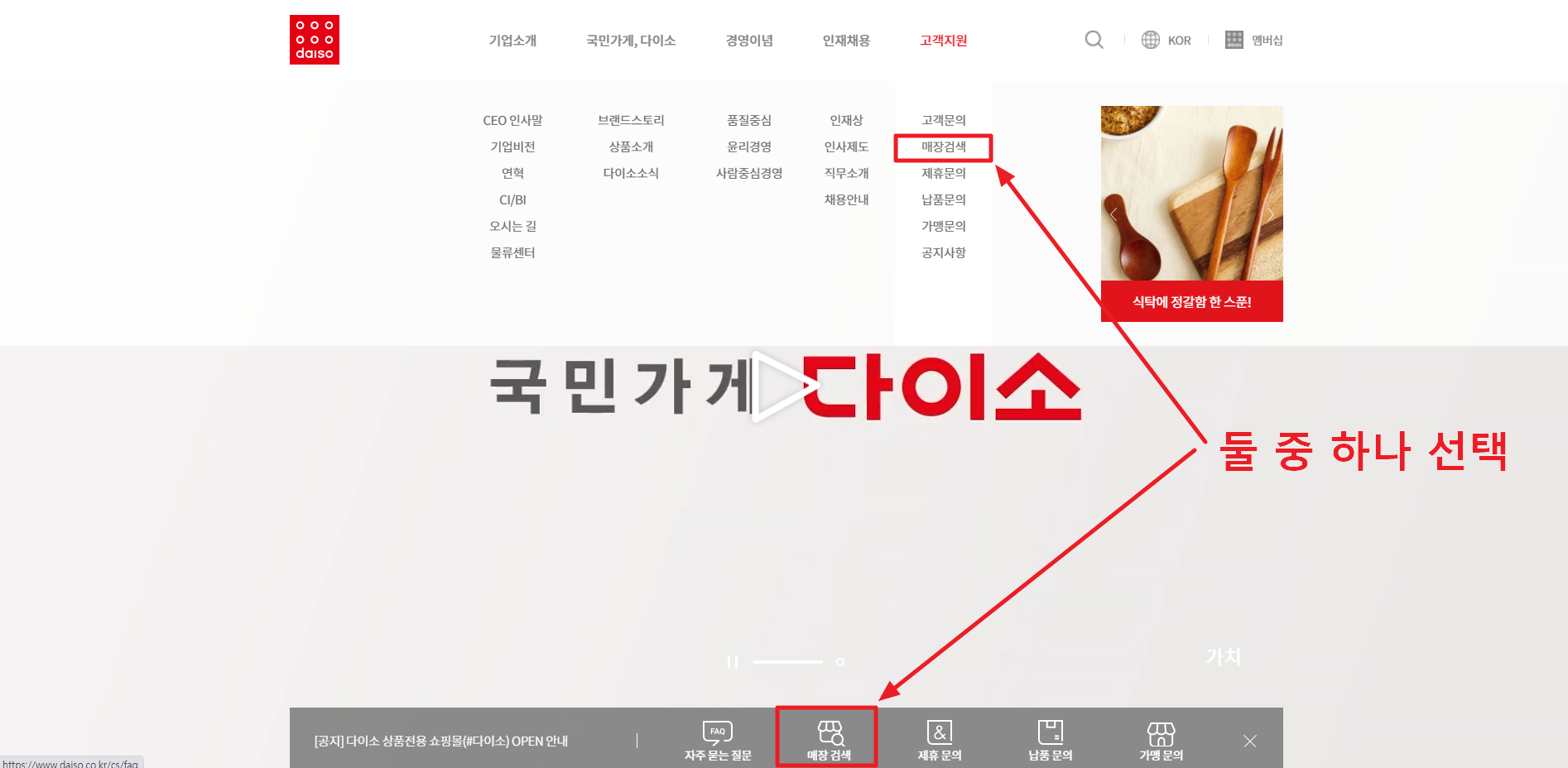 샵 다이소는 현재 시범서비스입니다. 차츰 지원 매장을 늘려간다고 하는데요. 추후에 추가되는 매장까지 검색하는 방법을 알려드리겠습니다. 일단 다이소 홈페이지에 들어갑니다.