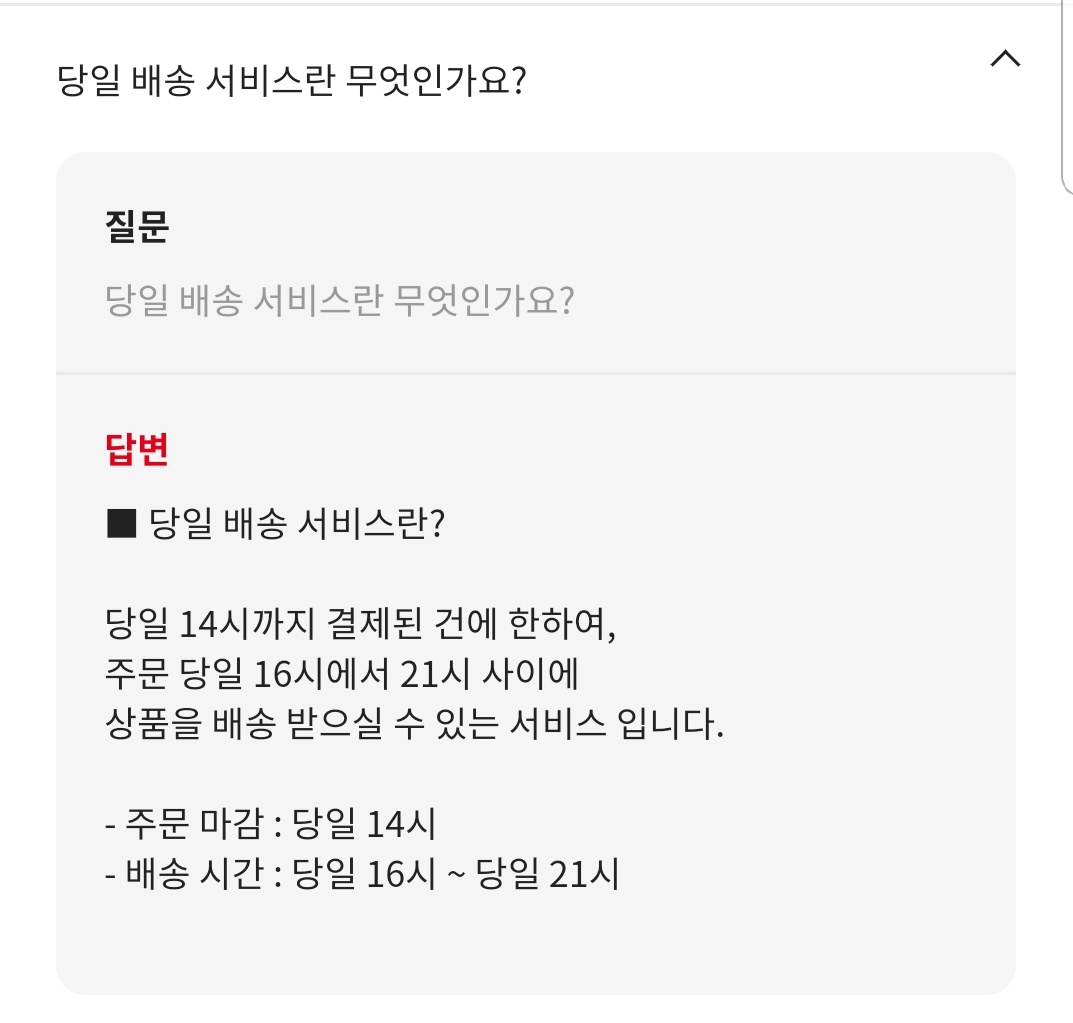 본인이 이용하는 매장이 샵 다이소 운영 매장이고, 당일 배송 서비스를 하려 한다면 당일 14시까지 결제해야 합니다.