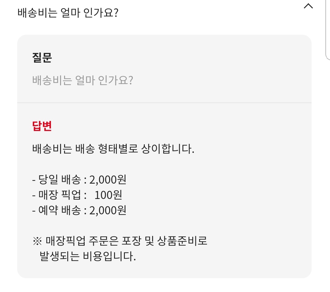 배송비도 물론 있습니다. 당일 배송과 예약 배송은 2000원입니다. 픽업 서비스를 이용할 때도 100원의 상품 준비비가 발생하니 참고하시길 바랍니다.