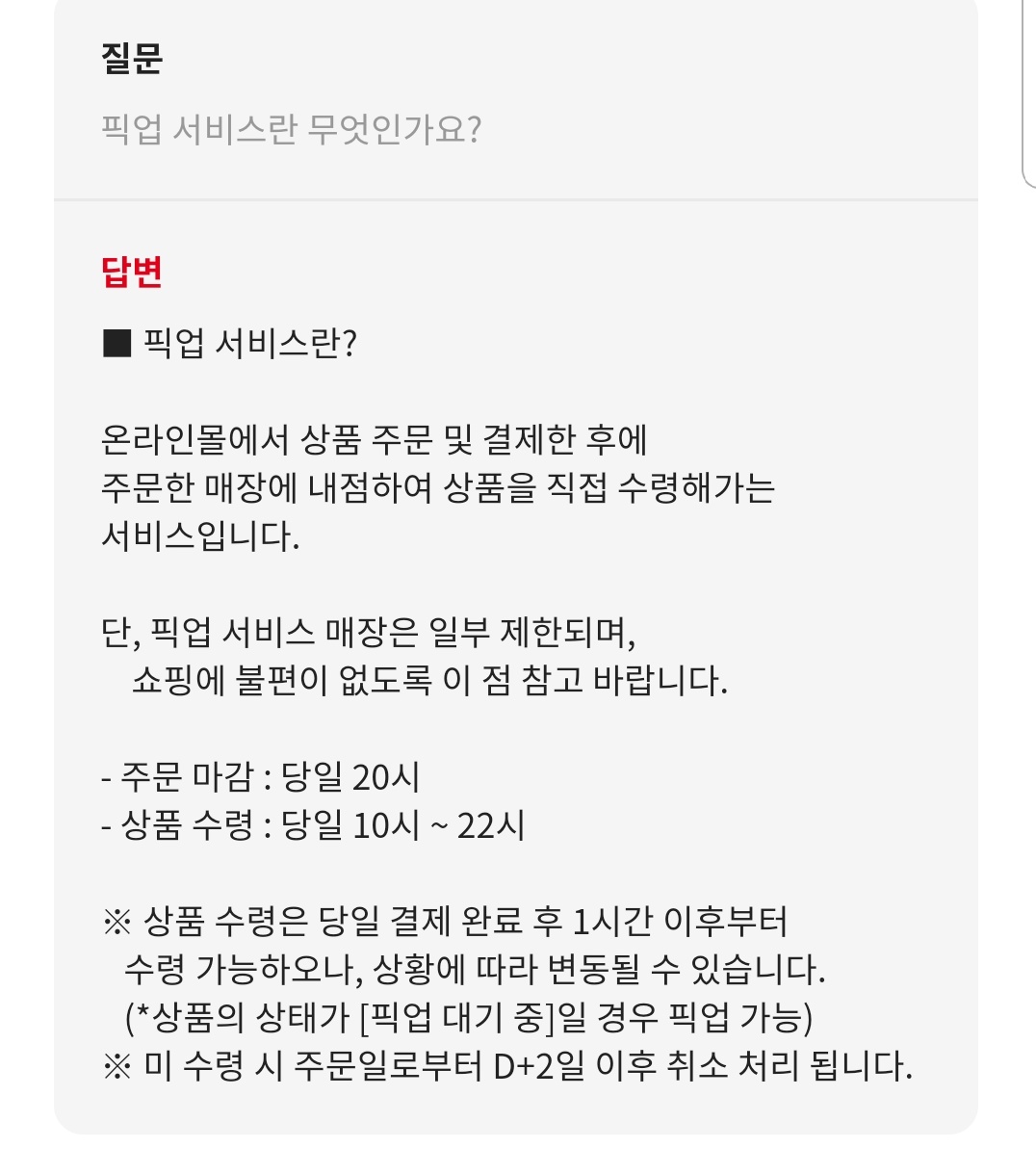 픽업 서비스를 이용하려면 당일 20시까지 주문해야 합니다. 상품 수령은 결제 완료 후 1시간 이후부터 가능하고, [픽업 대기 중] 상태면 픽업 가능합니다. 시간은 상황에 따라 변동될 수 있습니다.
