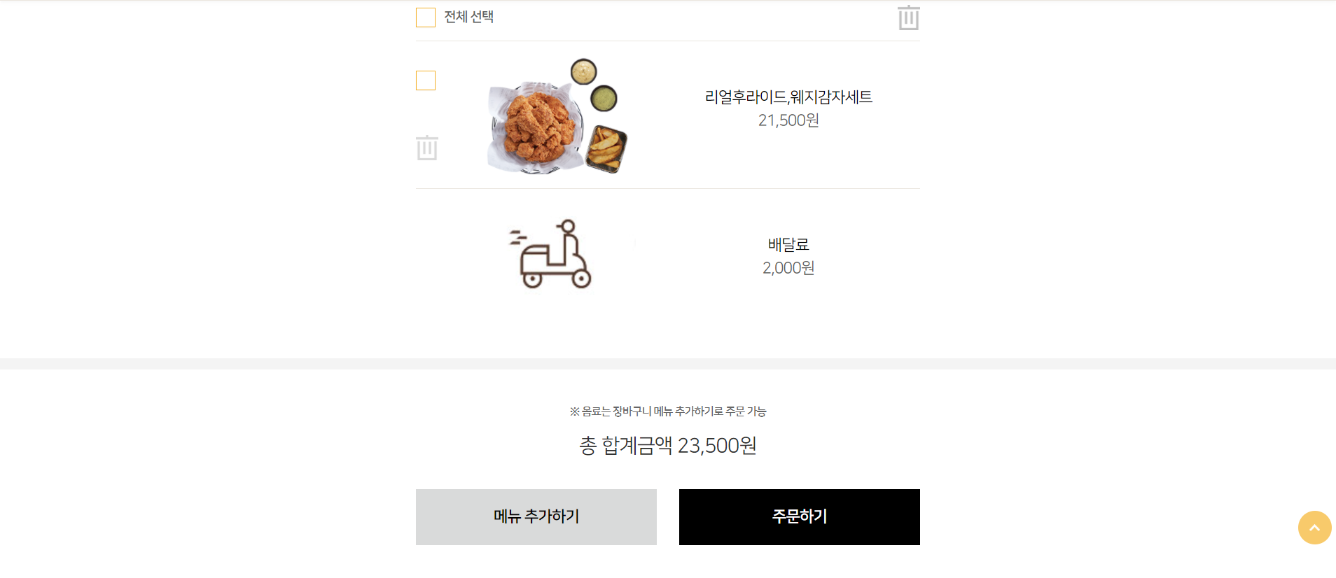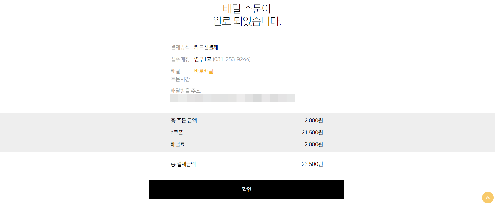 카카오톡으로 기프티콘을 선물 받아도 배달료는 받은 사람이 추가 결제해야 하기 때문에 약간 번거롭고 귀찮습니다. 하지만 그런 생각도 잠시, 배달료 2000원만 결제하면 치킨을 먹을 수 있다는 생각으로 행복해집니다! 그럼 이제 마지막 단계입니다.