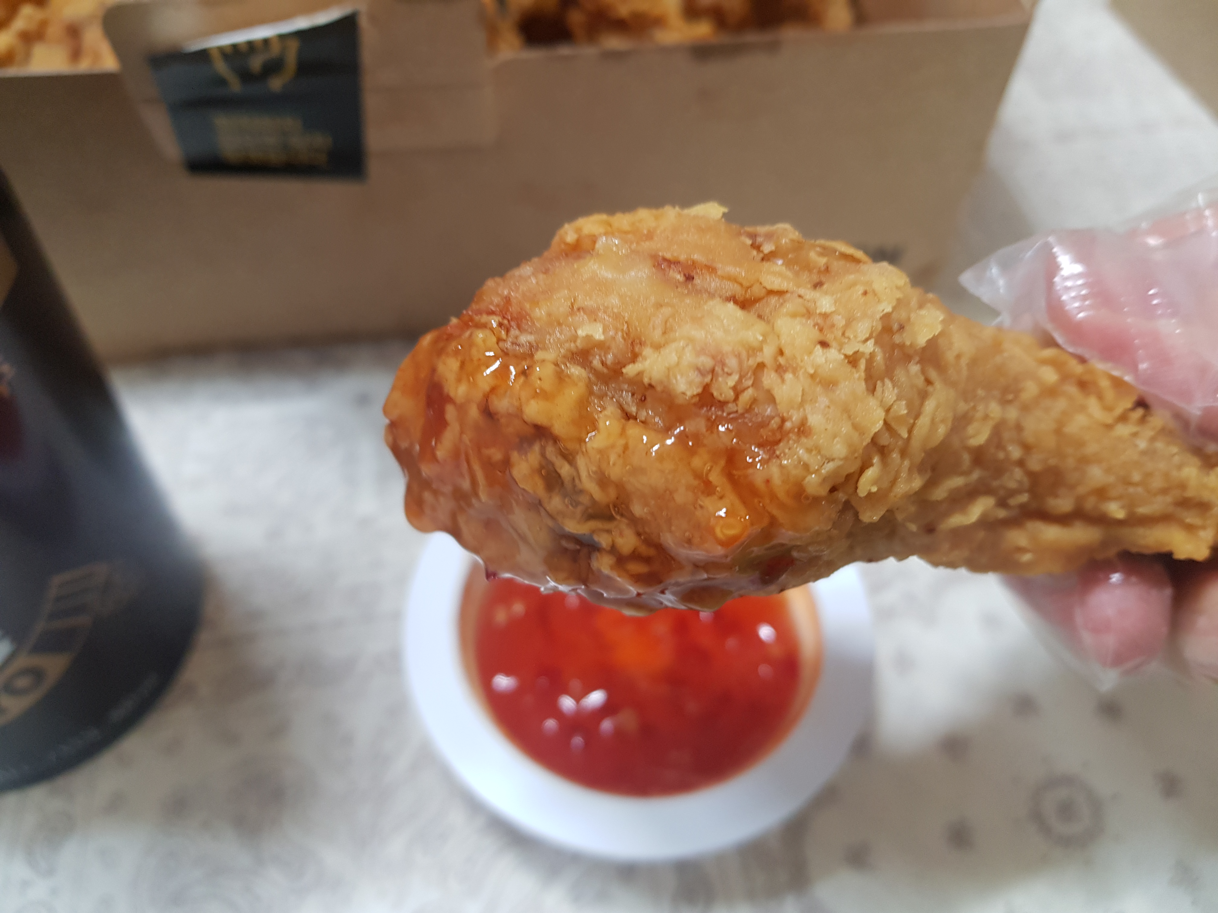 겉모습은 기존 후라이드와 별다른 점이 없어 보였는데, 먹어보니 차이점을 느꼈습니다. 제조 시 오트밀, 퀴노아, 아마란스를 사용해서 바삭하고 고소함을 살렸다는 게 실제로 먹어보니 느껴졌습니다. 기존의 오리지널 후라이드보다 약간 더 고소하고 바삭한 느낌? 간은 짭짤하기보다 비교적 삼삼한 느낌이기 때문에 같이 온 소스를 찍어먹었을 때 훨씬 좋았습니다.
