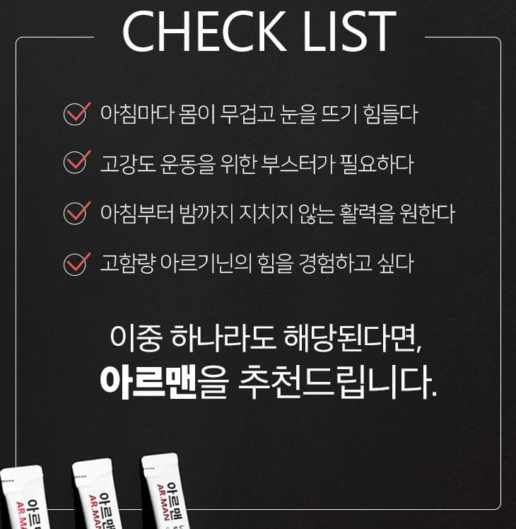 그런데, 여기서 바로 제가 아르맨을 구매하게 된 이유가 있습니다. 그 날 저녁, 평소처럼 헬스장을 못 가니 집에서 홈트를 하는데 '?!' 뭔가 느낌이 달랐습니다. 풀업과 푸시업을 하는데 평소 같았으면 더 하고 싶은 마음은 있어도 힘들어서 좀 쉬게 되고 그러는데 그날따라 힘들긴 힘든데 뭔가 더 할 수 있을 것 같은 느낌? 이 들었습니다. 확실히 운동이 잘돼서 이유가 뭘까 생각하다가, 낮에 먹은 아르맨덕분인가 싶어서, 좀 더 먹어보고 싶다는 생각에 바로 구매해버렸습니다. flex!