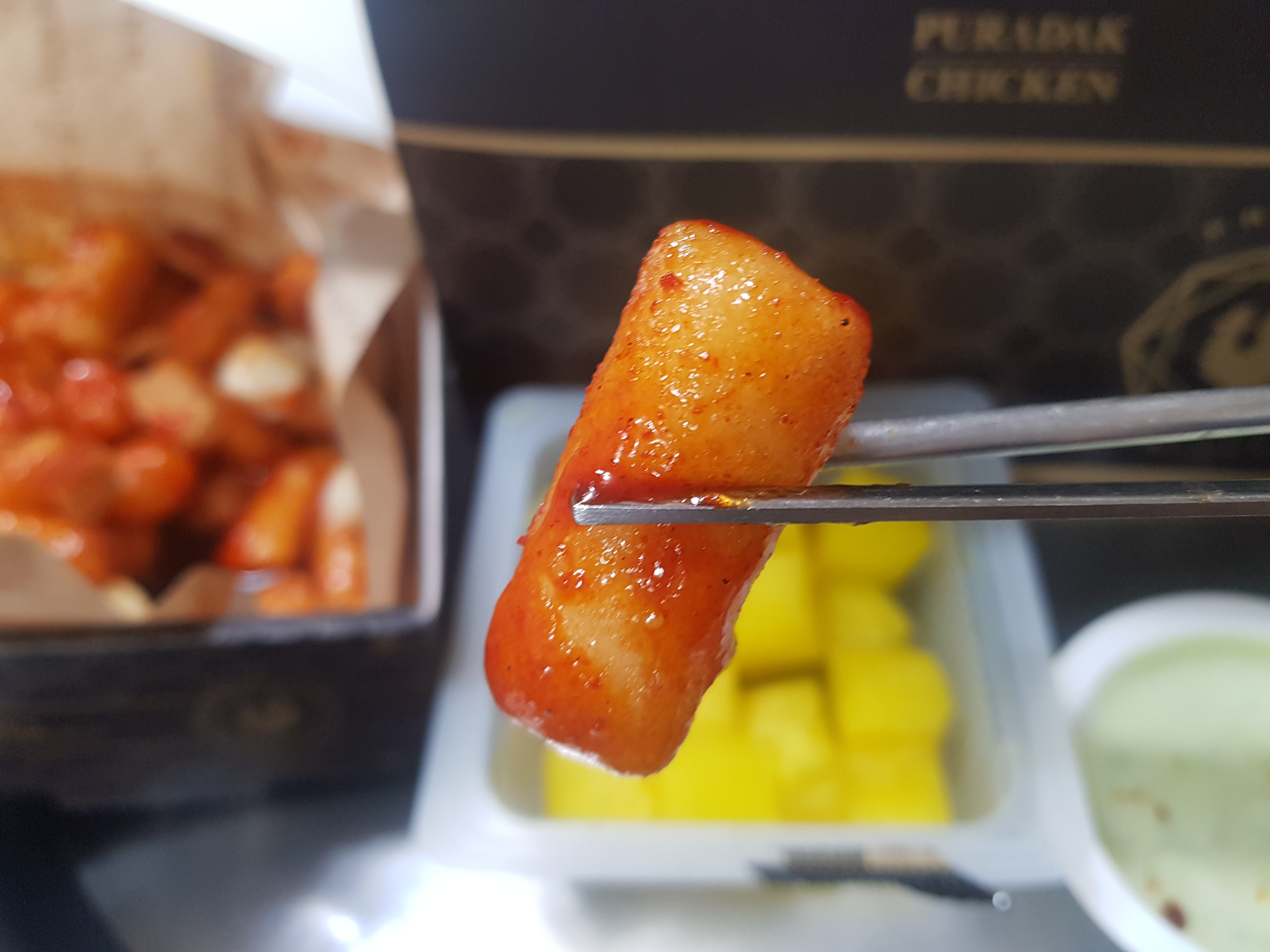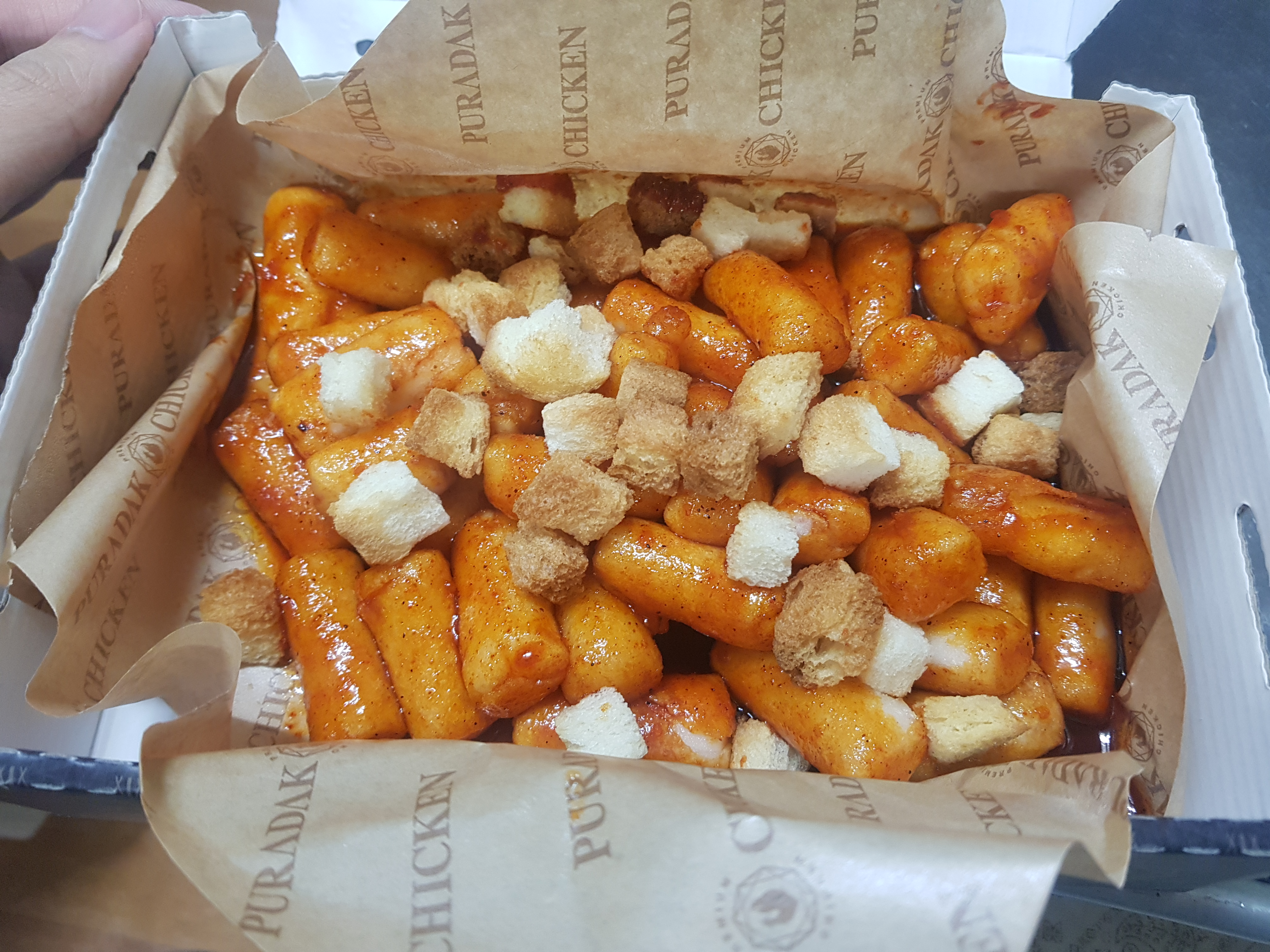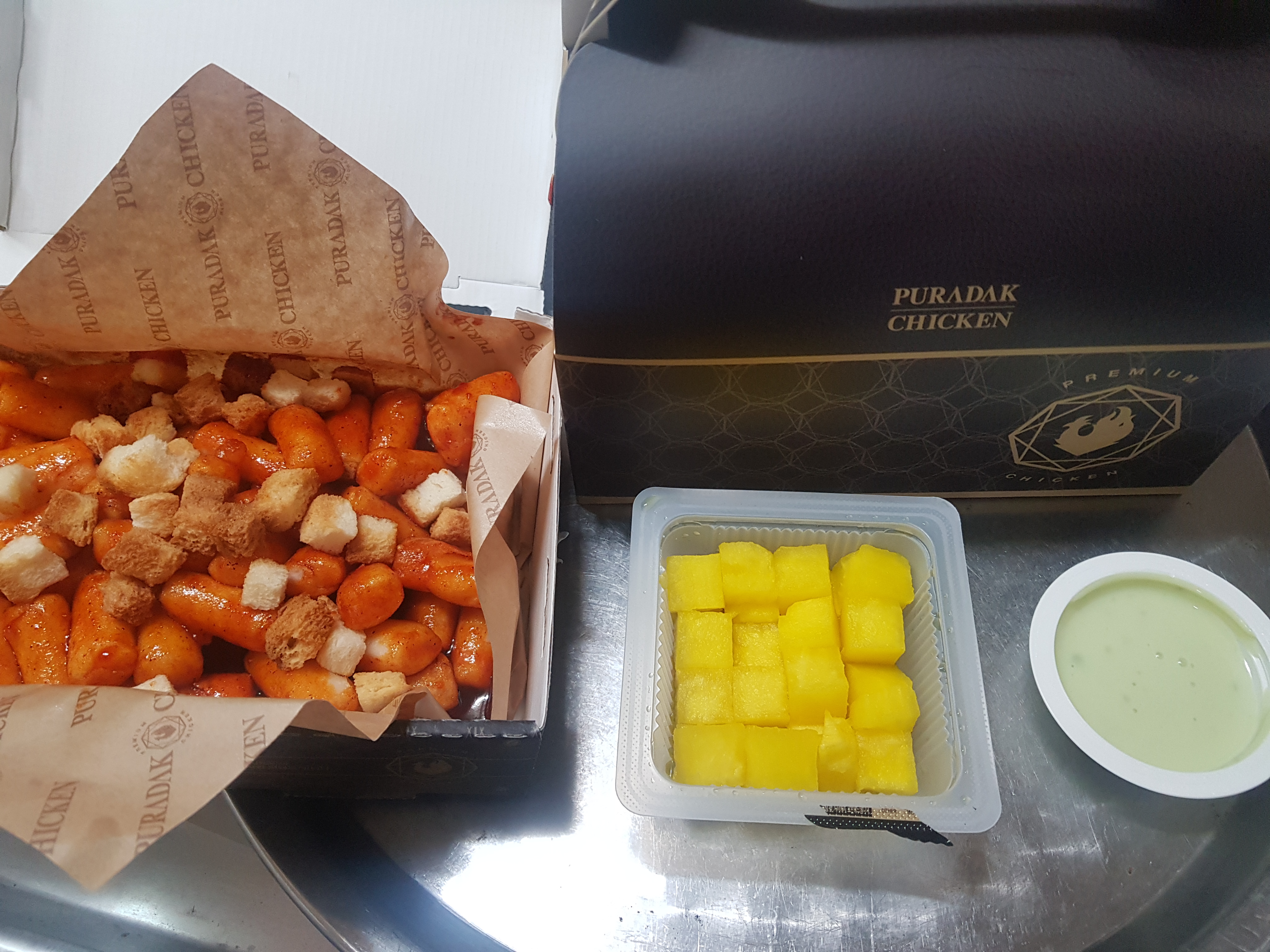 선택할 때 맛이 3가지가 있었는데, 레드, 블랙, 달콤. 그중에 치킨이 그래도 좀 느끼할 테니까 매운맛 떡볶이가 궁합이 잘 맞겠지? 하고 시킨 레드입니다. 확실히 매워요. 매운 거 못 드시는 분들은 적당히 블랙이나 달콤으로 가시길 추천드립니다. 기름떡볶이와 같이 식빵 팝콘처럼 작은 정사각형으로 튀긴 게 들어있는데, 매우니까 같이 먹으라는 의도인 것 같은데 식감이 바삭하고 좋았습니다.