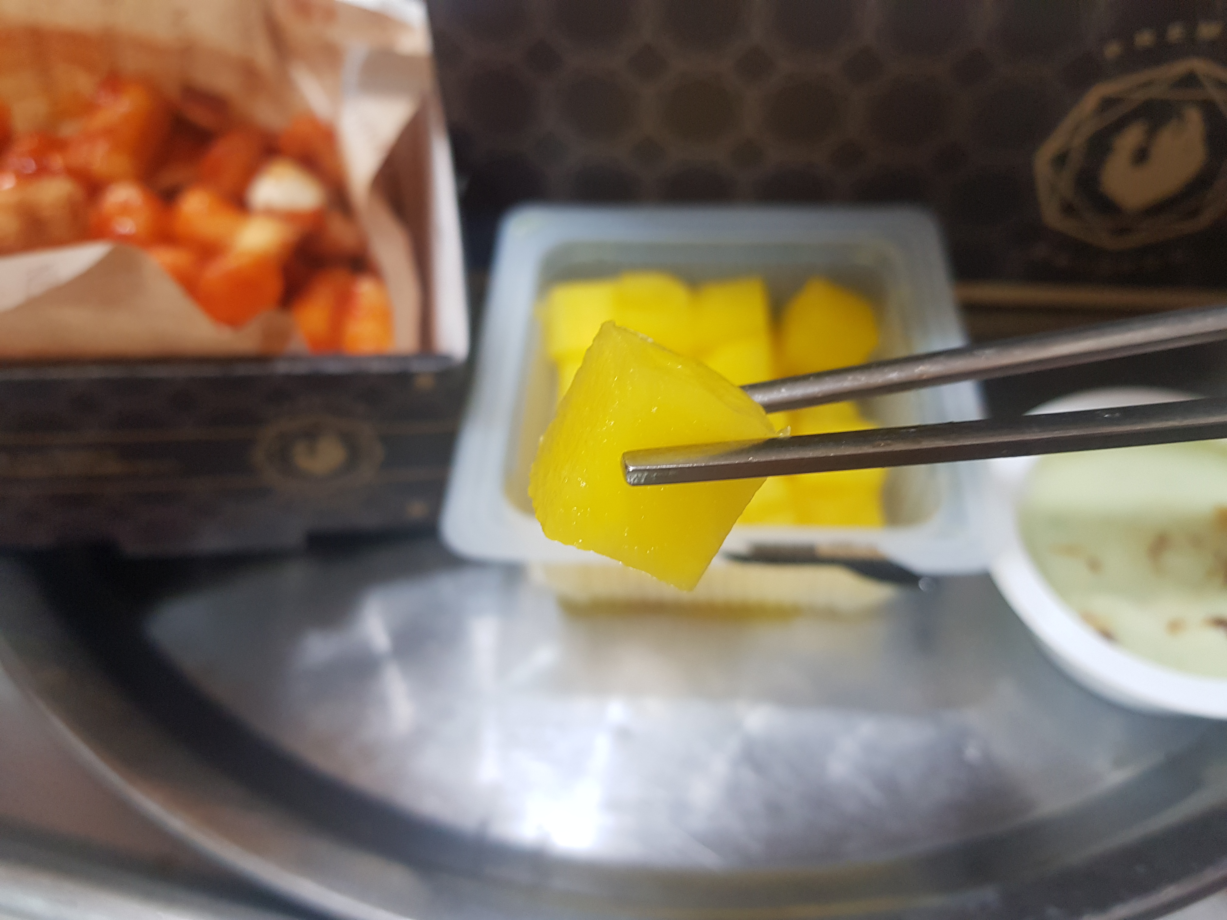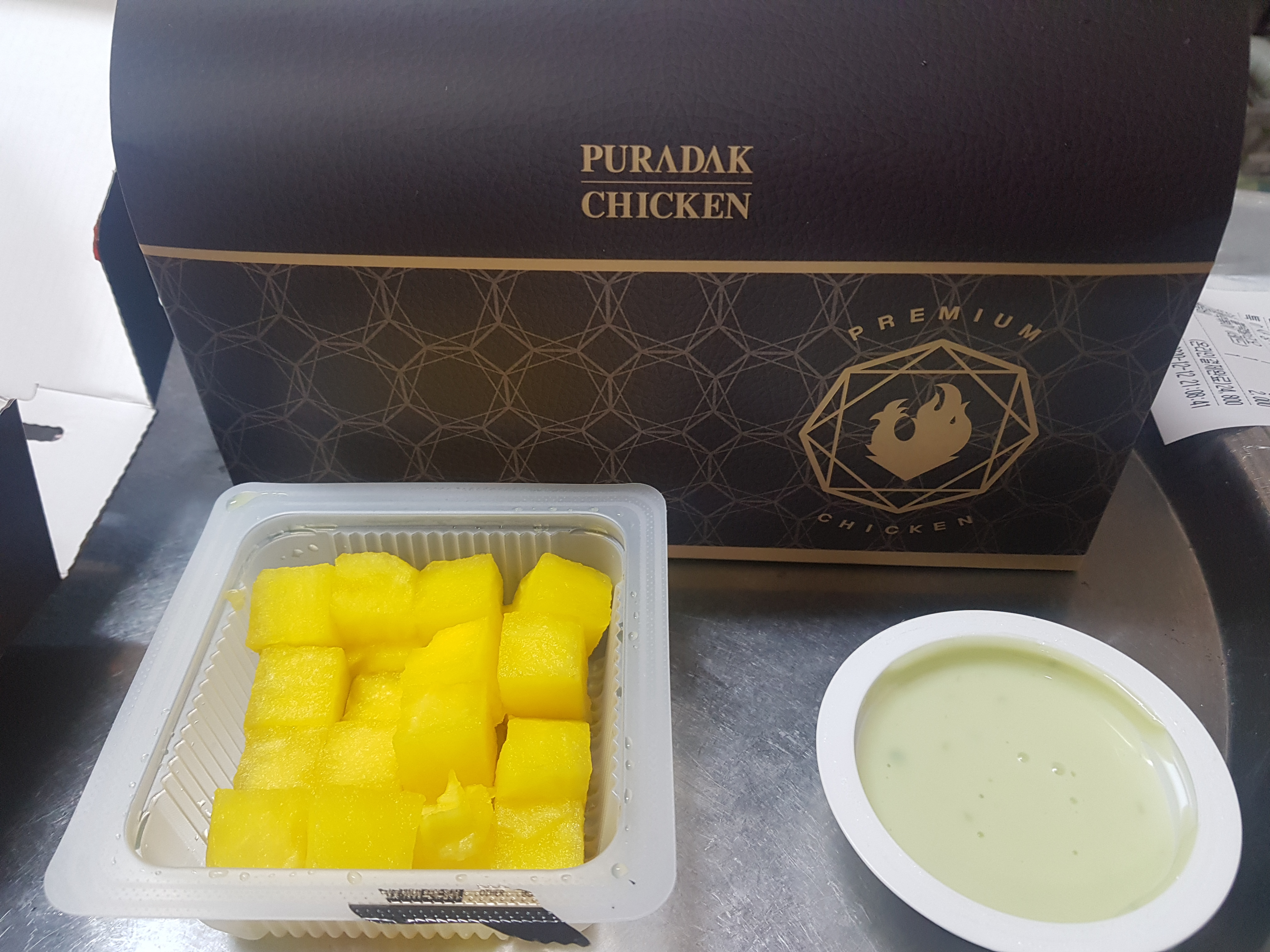 푸라닭은 치킨무가 노란색입니다. 포장 비닐에 보니까 치자로 물을 들였다고 써있구요. 특히 저는 이 치자 무가 마음에 드는 게, 기존의 치킨무와 달리 그렇게 시거나 맛이 강하지 않아서 좋은 것 같아요. 그래서 더 많이 먹게 되는데 하나 더 시킬걸 그랬습니다. 그리고 같이 손 소스는 '고추 마요' 소스입니다. 치킨이 주는 느끼함을 약간의 매콤한 소스로 잡아 주는 게 좋았습니다.