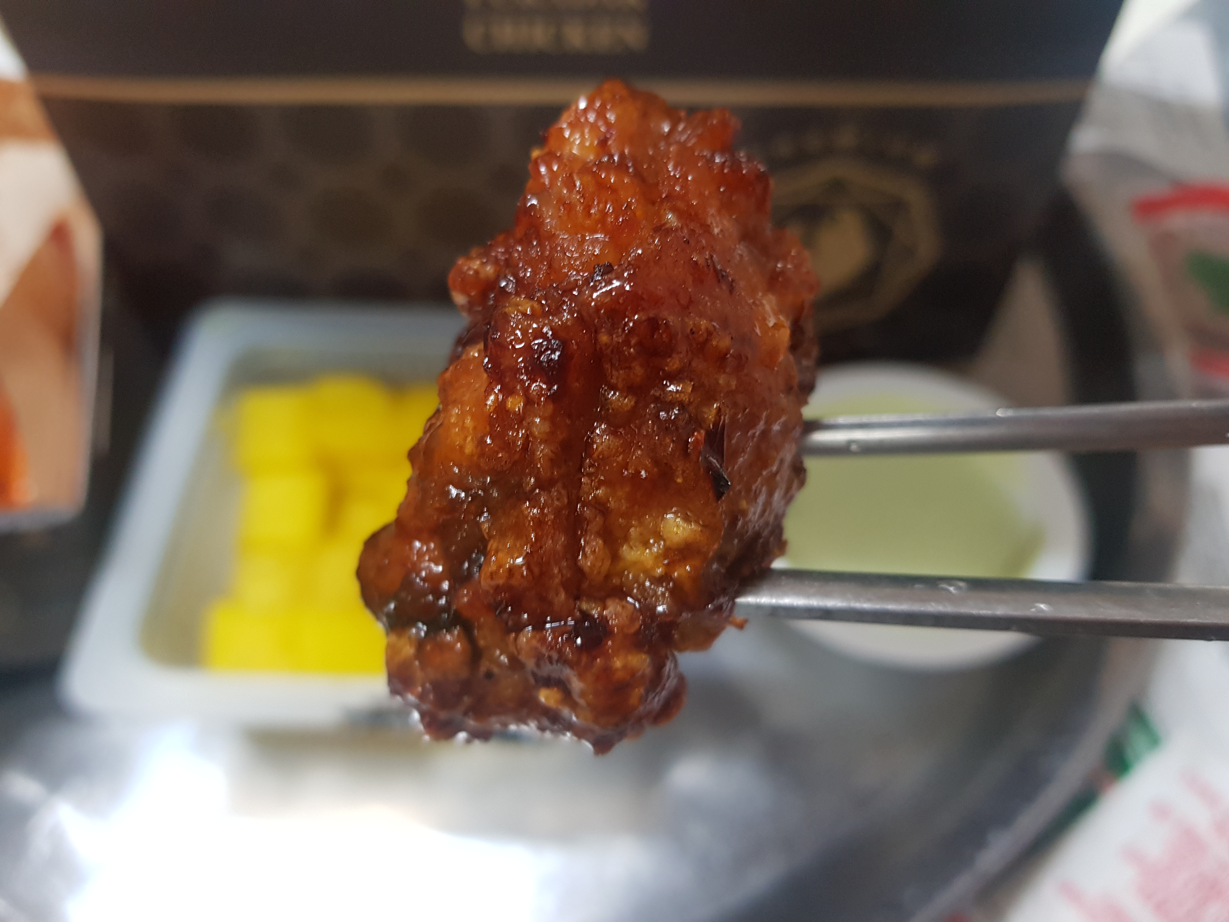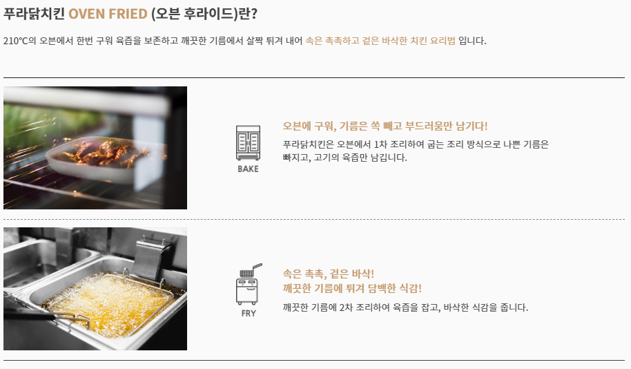 먹으면서 느낀 게 있는데 튀김은 바삭한데 안에 살은 굉장히 부드러운 순살이라는 점입니다. 그냥 어중간한 게 아니고 완전히 바삭하고 완전히 부드러워요. 그래서 찾아보니 조리방식이 오븐에서 1차로 바삭하게 한 번 구워낸 다음에 2차로 튀기는 방식으로 조리하고 있었습니다. 그래서 겉은 바삭하고 안은 촉촉한 진정한 '겉바속촉'을 이뤄낼 수 있었나 봅니다.