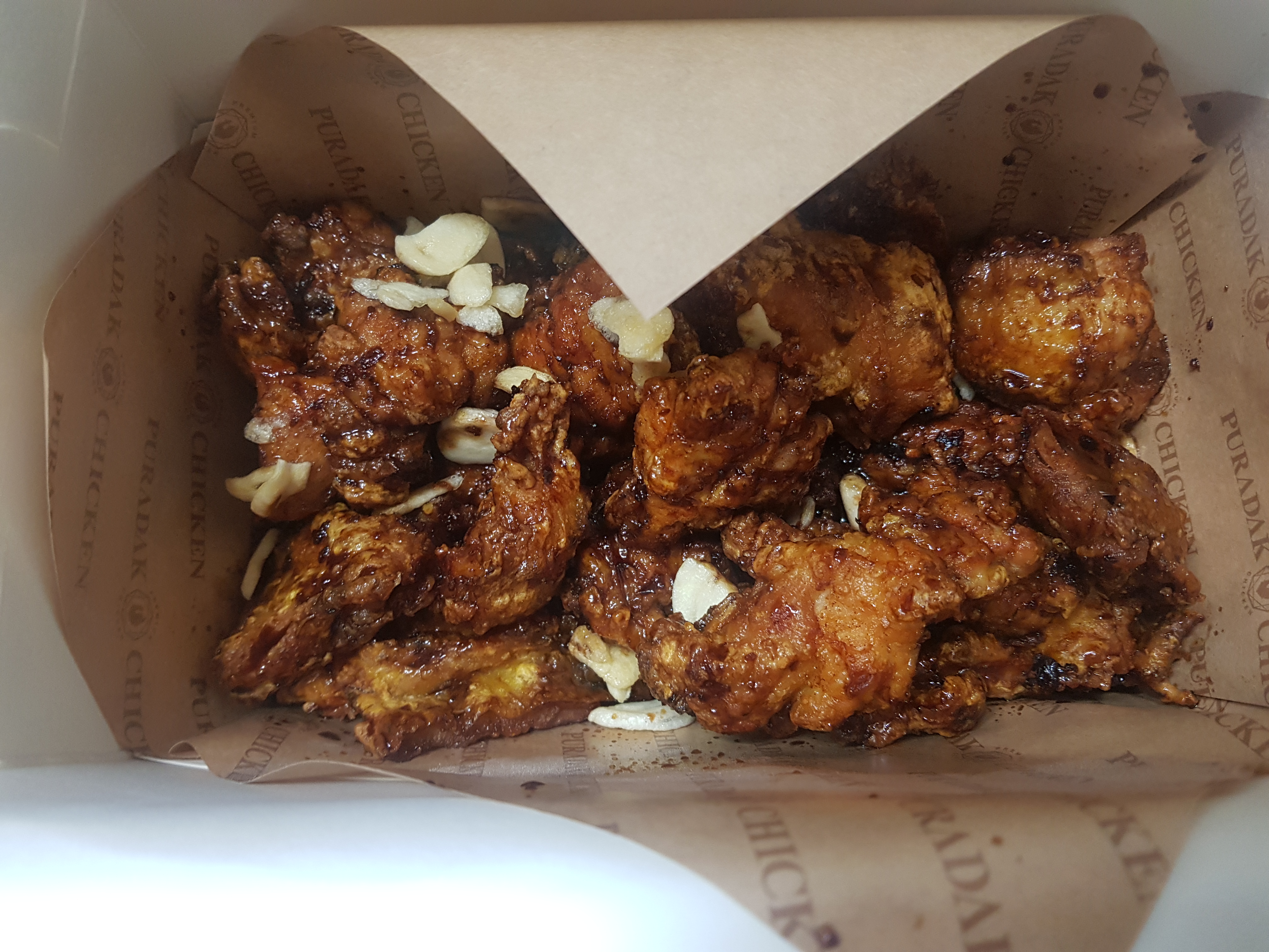 진한 간장 베이스 + 마늘이 주재료인데, 것 보기와 다르게 하나도 안 짭니다. 보통 다른 브랜드의 갈비치킨, 간장이 베이스로 된 치킨을 먹어보면 처음엔 괜찮았는데 먹다보면 짜서 더 먹기 좀 힘들때가 많은데 푸라닭 블랙알리오 순살은 안짭니다. 그래서 좀 더 많이 먹을 수 있어요! 같이 곁들인 마늘도 식감에 한 몫하고 전체적인 맛 밸런스가 좋은 느낌입니다. 순살 덩어리도 한입 보다 약간 더 크게 커팅되어있어서 한입 가득먹기 좋고, 단지 한 가지 아쉬운 점을 얘기하자면 양이 좀 적게 느껴진다는 것? 이 부분은 맛있어서 금방 없어져서 그런 건가 싶네요!