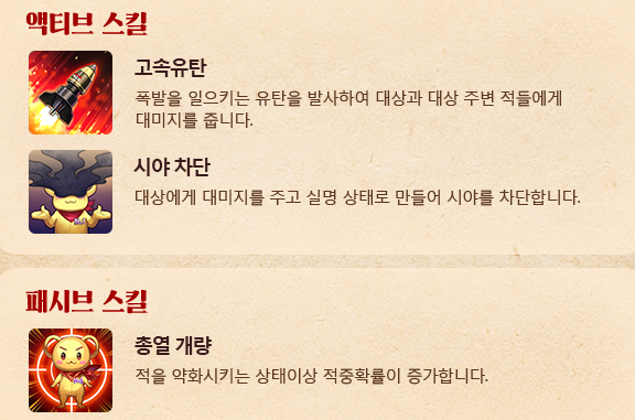 다른 게임에서는 '궁수'정도의 직업이라고 볼 수 있는데, 원거리 딜러로 광역기 스킬인 '고속유탄'을 가지고 있고 디버프 겸 공격 스킬인 '시야 차단'이 있습니다.