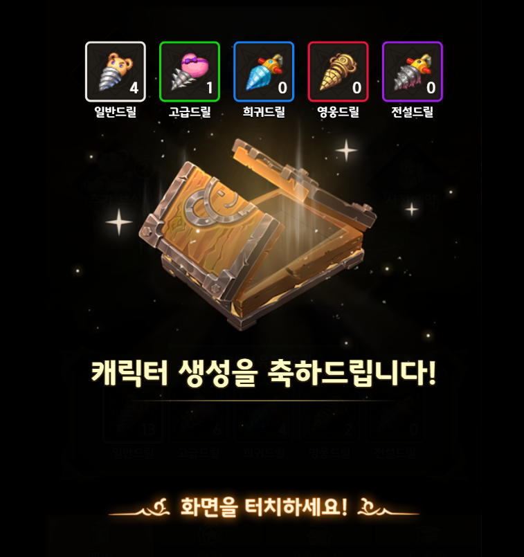 ▼추가 보상을 누르면 현재 받을 수 있는 보상을 획득 가능한데요. 처음 캐릭터를 만들 때 주고, 매일 하나씩 상자를 줍니다. 상자에서는 드릴이 랜덤 하게 나오구요.