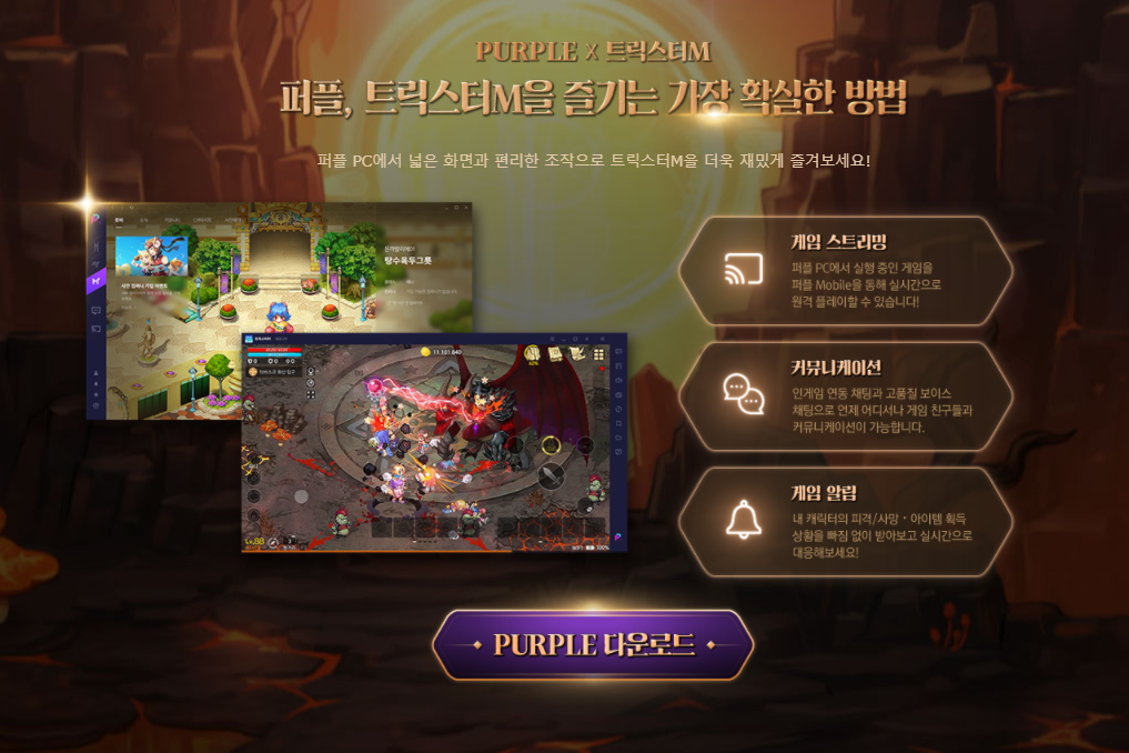 모바일 게임을 PC에서도 할 수 있게끔 도와주는 프로그램인 '퍼플'입니다. 앞서 이벤트 혜택에서도 살펴봤듯이 퍼플을 설치하고 퍼플 안에서 미니게임 실행 후 추가 보상을 클릭하면 '드릴'을 획득할 수 있습니다. 트릭스터m 말고도 NC에서 서비스하는 '리니지 M' 도 플레이 가능합니다.