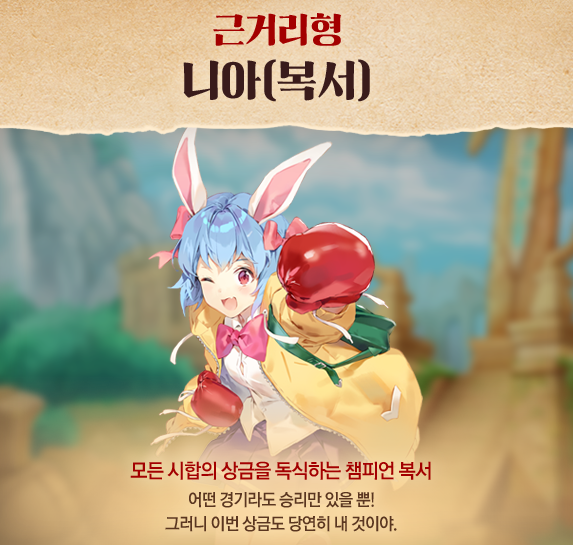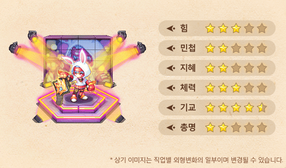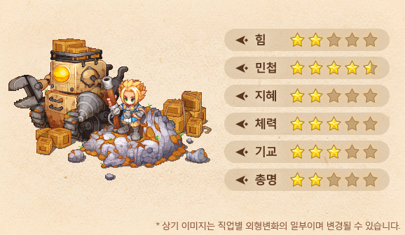 제가 고른 직업이기도 한 근거리형 복서 니아입니다. 스탯을 보면 근거리형임에도 힘 스탯이 별 3개밖에 안되는데, 유난히 '기교 스탯'이 높은 걸 볼 수 있습니다. 아직 기교 스탯이 어떤 능력치에 작용하는지 모르겠지만, 제 예상으로 추측해보건대 스킬의 쿨타임이 줄어들거나 확률을 높이는 데에 작용하지 않을까 싶습니다. 궁금하네요.