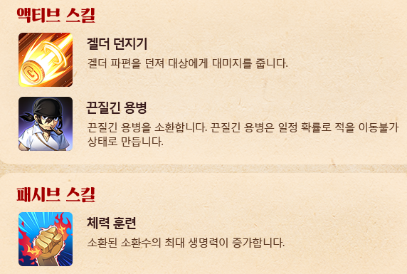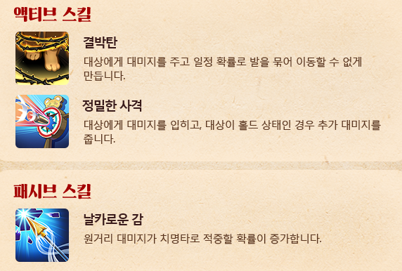 이유는 스킬 구성을 보면 알 수 있는데요. '결박탄'으로 이동하지 못하게 디버프를 걸고, 디버프가 걸리면 추가 대미지를 줍니다. 메인 스킬이 광역 스킬인 레오와 비교되는 부분이기도 한데, '한놈만 팬다' 이런 느낌? 공통점은 둘 다 패시브 스킬은 적중 확률이 증가하는 스킬로 구성되어 있다는 점이네요.