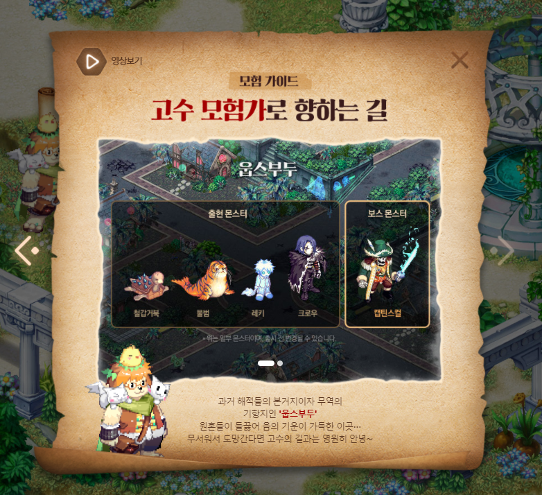 초보자들의 게임 진행을 돕고자 가이드 '포푸리'가 사냥터 별로 설명해 줍니다. 초보, 중수, 고수 별로 가야 할 곳과 맵에서 나오는 몬스터들을 알려줍니다. 특히 '고수 모험가'에서 '물범'과 '철갑 거북'은 정말 지겹게도 잡았던 기억이 나네요. 그때는 보기도 싫었는데, 지금 이렇게 다시 보니 왠지 모를 향수가 느껴집니다.