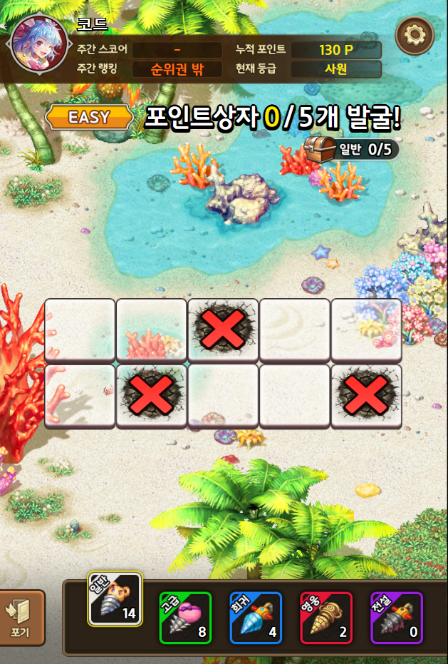 아까 말씀드린 것처럼 운 없으면 저같이 연속 빈 땅만 파고 드릴 날립니다. 그렇게 어찌어찌 성공하면 상자를 오픈할 수 있는데 상자에서는 랜덤 하게 포인트를 획득할 수 있습니다. 참고로 3가지 난이도가 존재하는데, 난이도가 높을수록 블록 칸 수가 배로 늘어나기 때문에, 드릴이 무조건 부족할 겁니다. 그럼 그 드릴은 어떻게 얻느냐?!