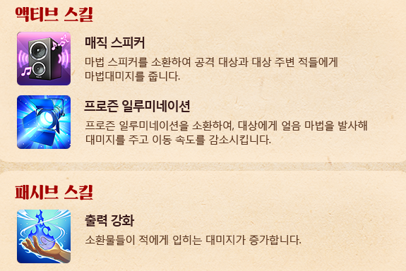 마지막 캐릭터인 매력형 '제니'입니다. 같은 매력형인 홀든 보다는 좀 더 '공격적인 성향'의 소환술사라고 할 수 있습니다. 슈퍼모델 컨셉답게 공격 스킬도 스피커와 조명으로 공격을 합니다. 설치형이고, 광역 스킬과 디버프 공격 스킬로 구성되어 있습니다.