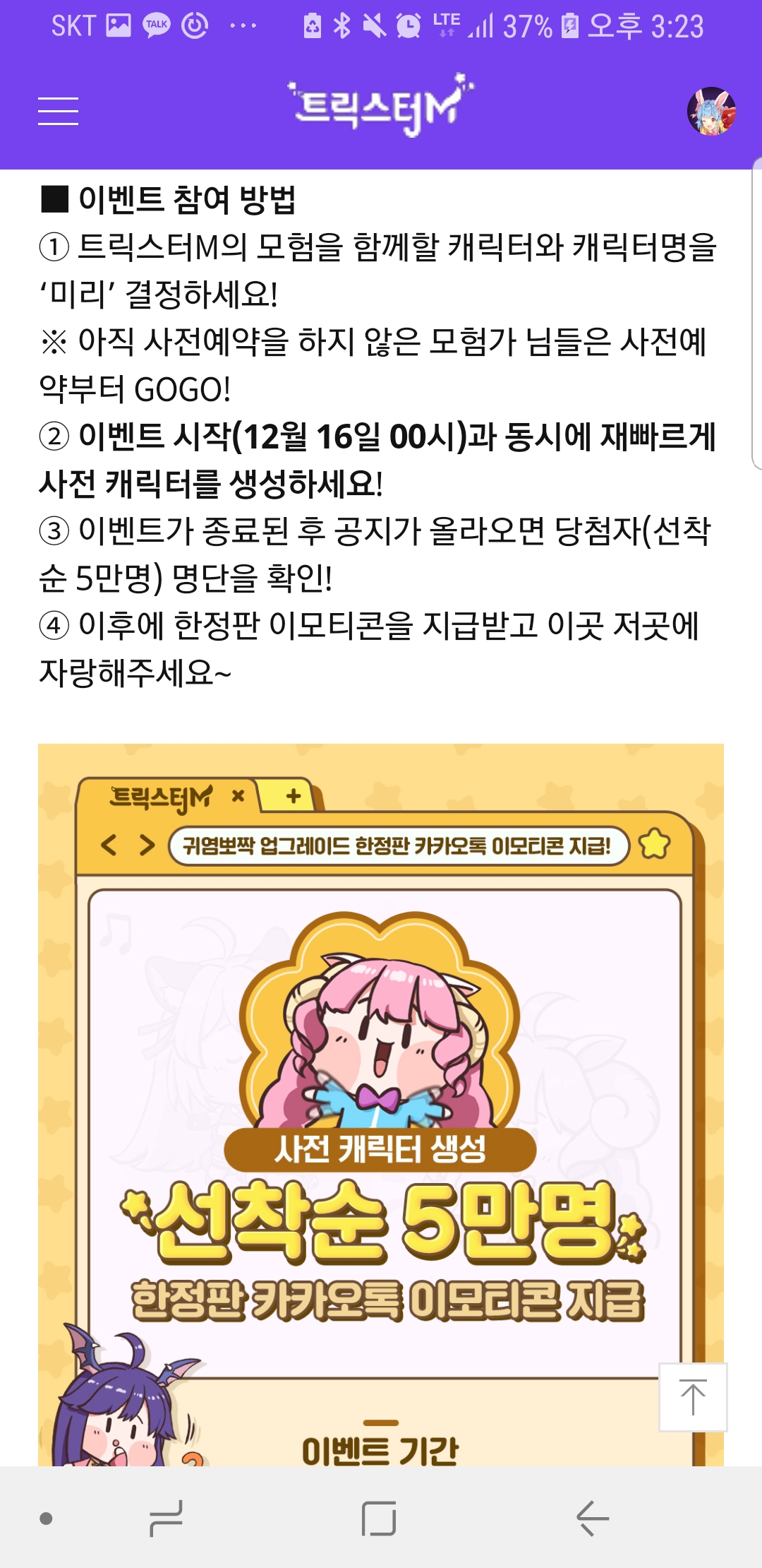 사전 캐릭터를 생성하신 분들 중, '선착순 5만 명'에게 [트릭스터m 업그레이드 한정판 카카오톡 이모티콘]을 지급합니다. 저번 한정판 이모티콘이 반응이 좋았는지 이번에 업그레이드 돼서 돌아왔네요. 저도 당연히 사전예약에 참여했기 때문에 참가가됐겠지만 선착순 5만명 안에 들었을지는... 모르겠습니다. 이벤트 종료 후 발표한다고 하니 기다려 봐야겠네요.