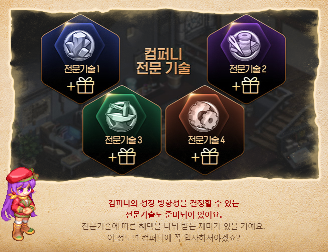 컴퍼니 구성원들은 '기여도'에 따라서 직급을 부여받고, 직급에 따라 차별화된 혜택을 지급받습니다. 내부적인 혜택으로는 이렇고, 컴퍼니를 성장시키면 또 다 같이 누릴 수 있는 '전문 기술' 혜택을 받을 수 있습니다. 아직 캐릭터밖에 만들지 않았지만 뭔가 시작하면 열심히 해야겠다는 생각이 드는 부분이네요.