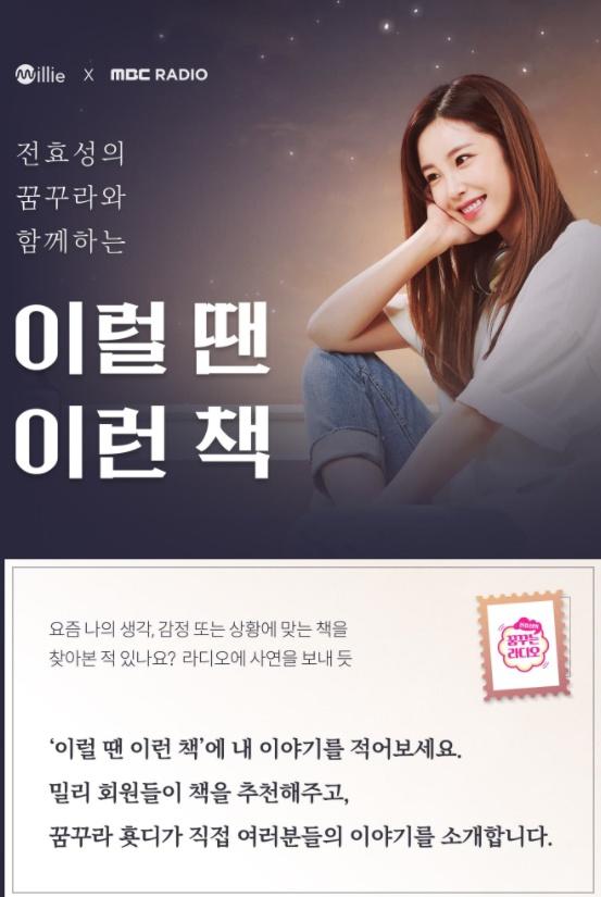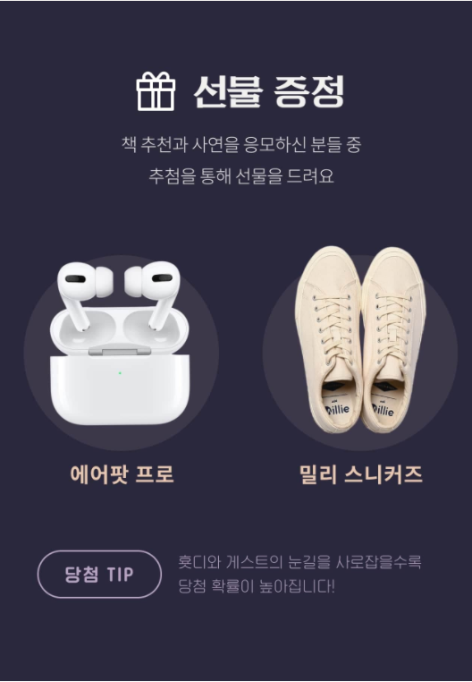 매주 목요일 8시에 MBC FM4U 91.9 전효성의 '꿈꾸는라디오'에서 책 추천을 받고 있습니다. 밀리의 서재 회원들이 자신의 사연과 함께 책 추천을 하면, '횻디'가 직접 책을 소개하는 시간을 가지는 데요. 추첨을 통해서 선정되신 분들은 에어팟 프로, 밀리 스니커즈를 증정한다고 합니다. 이번 기회에 본인이 좋아하는 책을 추천해서 상품도 타보세요!