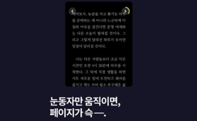 '시선 추적' 기능은 소프트웨어 기업 '비주얼캠프'에서 개발한 기술인데요. 밀리의 서재에서 국내 최초로 선보인다고 합니다. 이 기술은 지난 11월 밀리의 서재 자체 뷰어에 적용되었습니다. 이제는 글을 읽다가 손을 움직여서 아래로 스크롤하는 방식을, '전면 카메라'를 이용해서 내 눈동자를 추적한 시스템이 알아서 스크롤을 내려준다는 겁니다.