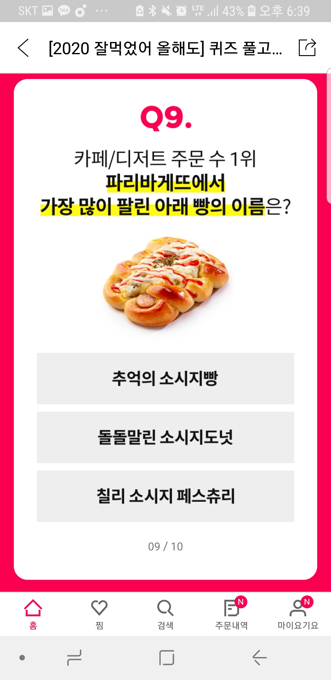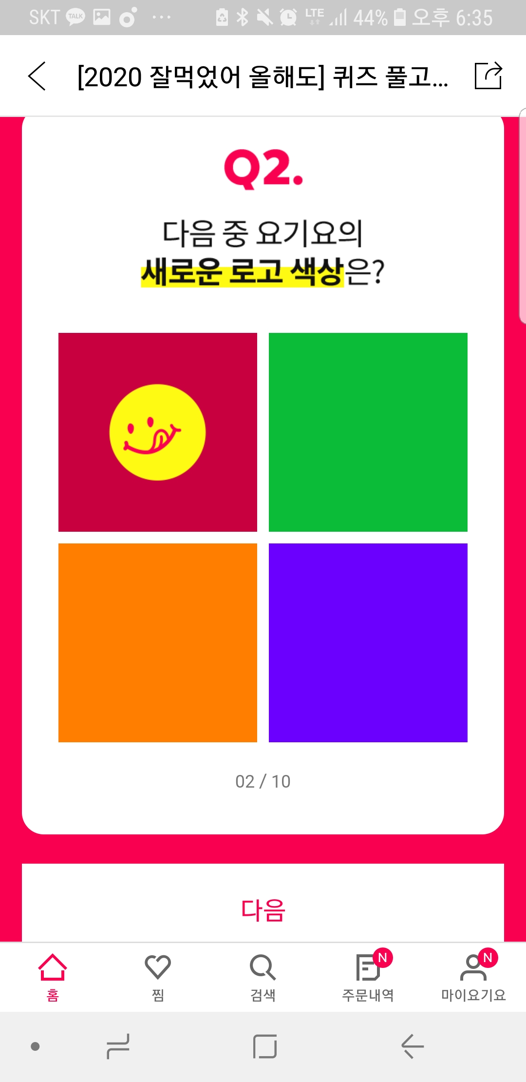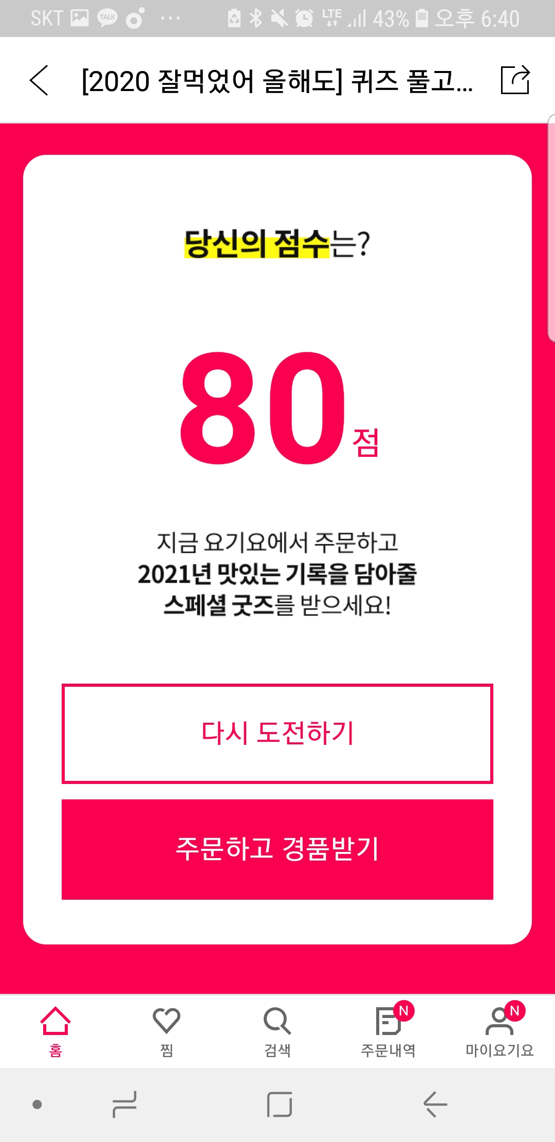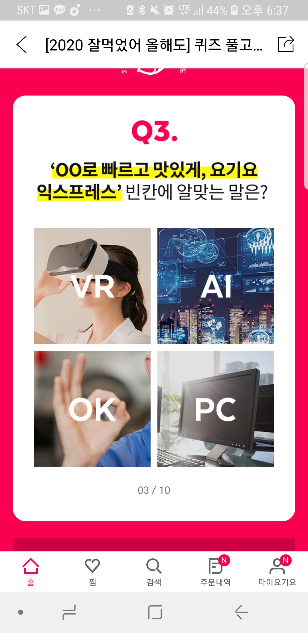 요기요 어플을 키니 포토퀴즈 풀고 굿즈 받으라네요? 뭔가 싶어서 들어가 보니 '2020 잘 먹었어 올해도!' 퀴즈 이벤트를 진행 중이었어요. 추첨을 통해서 2021명에게 '요기요 1회용 필름 카메라'를 증정한다고 하네요. 문제는 총 10개 문항으로 구성되어있고 간단합니다. 처음에 별생각 없이 문제를 풀어보았는데 점수가..
