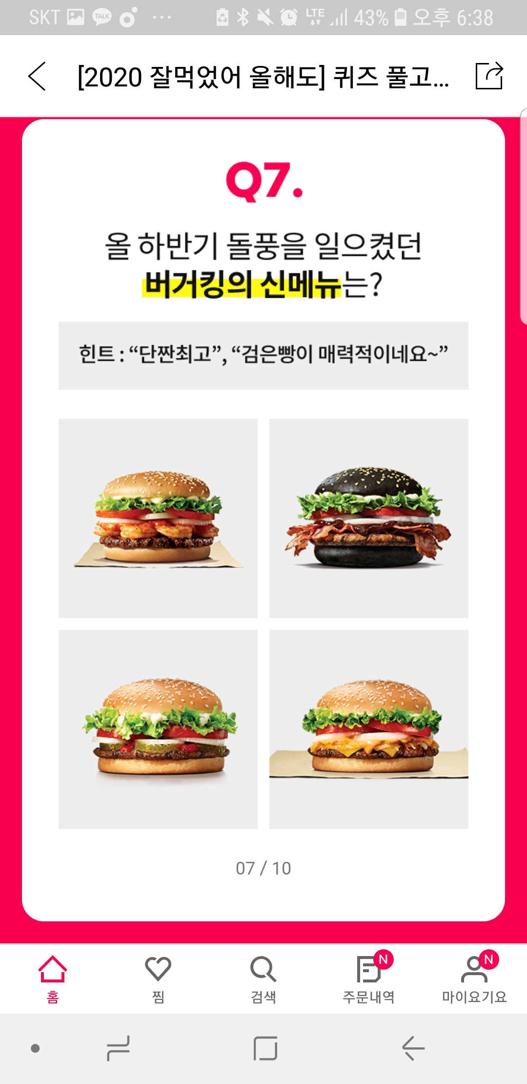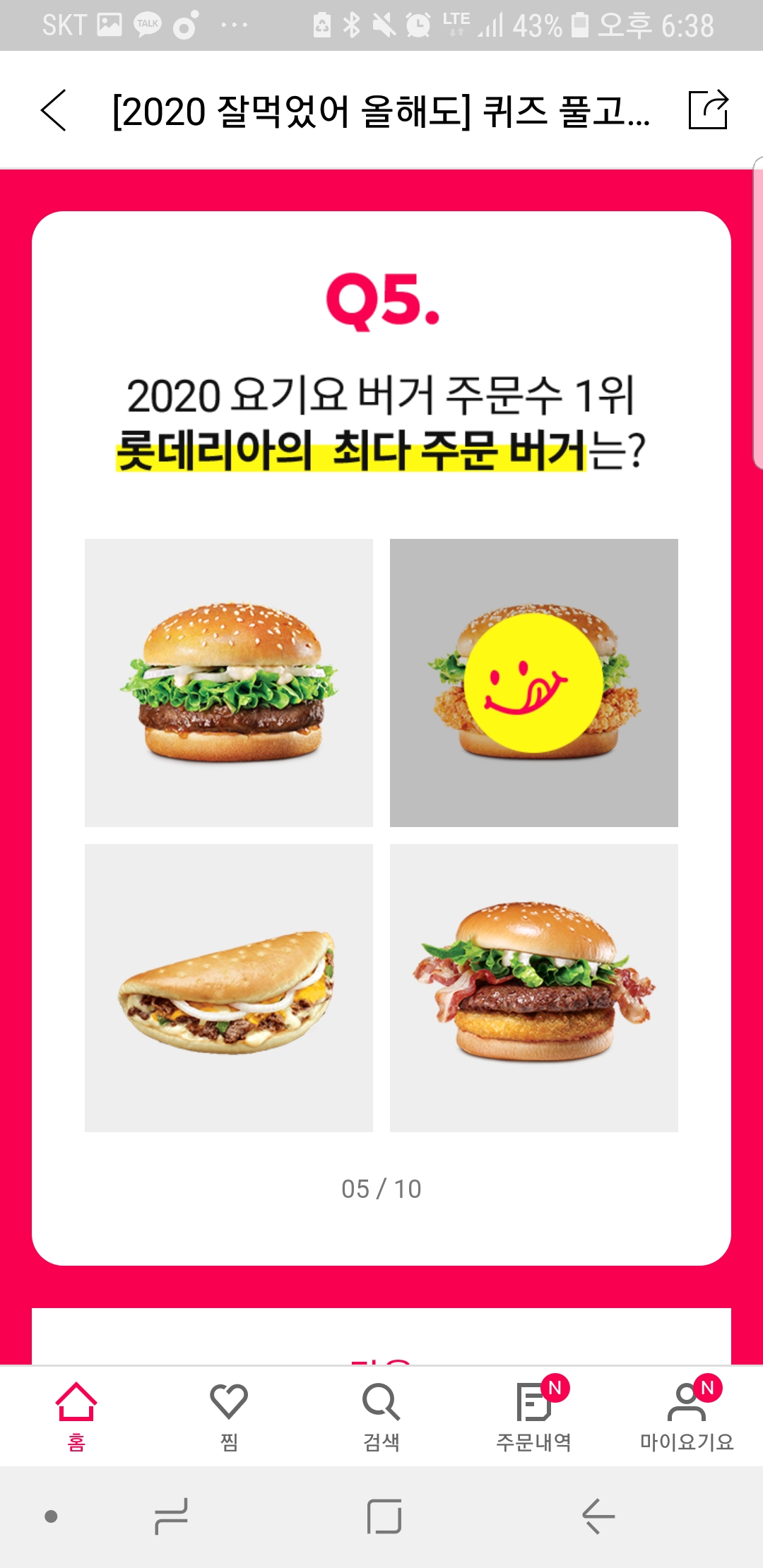 5번 문제는 제가 틀린 문제이기도 한.. 롯데리아 주문 1위 문제였습니다. 솔직히 고민했는데 그래도 '핫크리스피 버거'가 제일 대중적인 사랑받는 메뉴이지 않을까 했는데, 답은 불고기버거였습니다. 답은 첫 번째 이미지인 '불고기 버거'