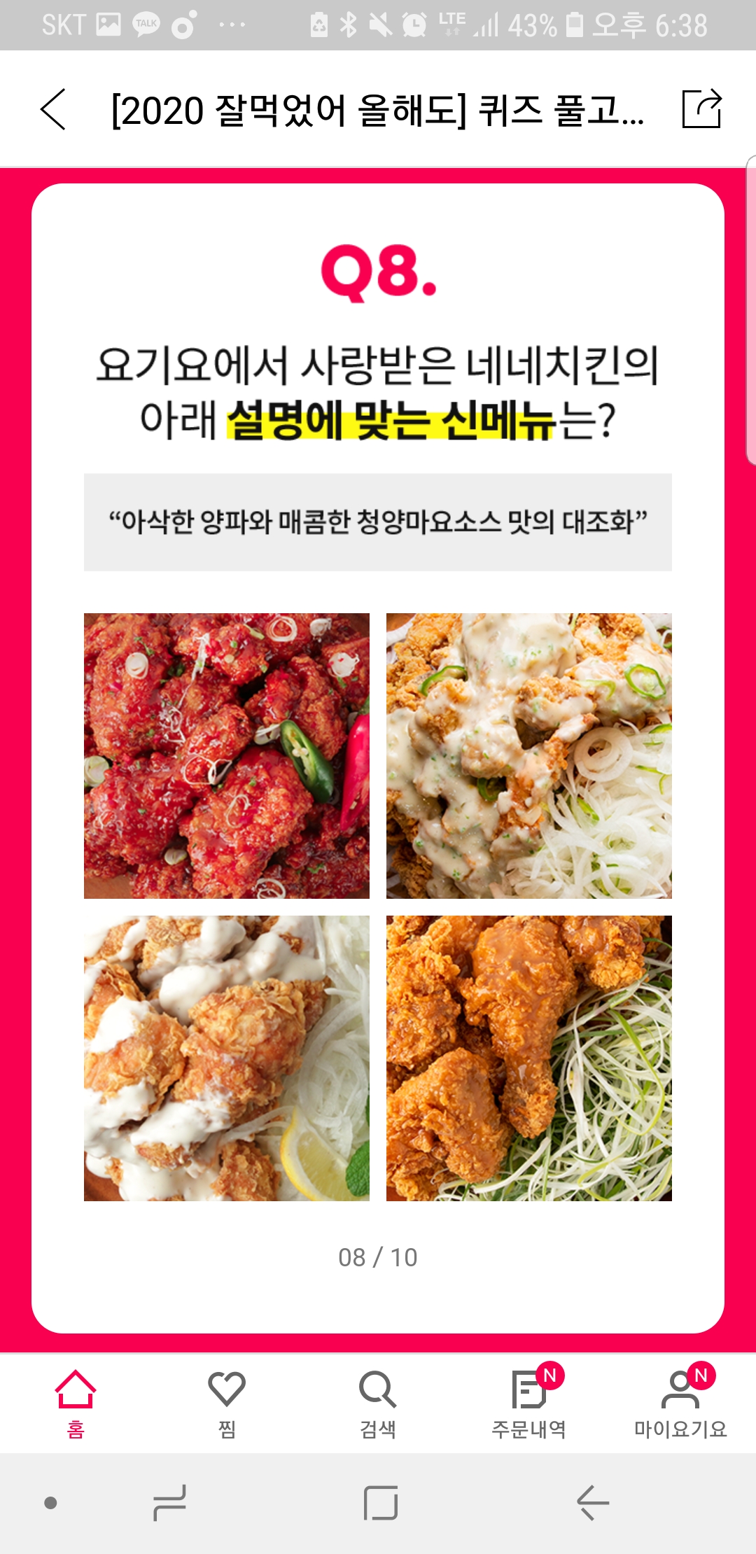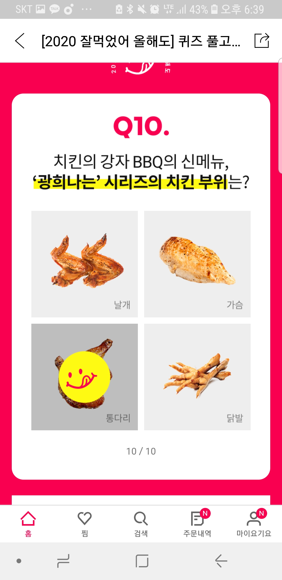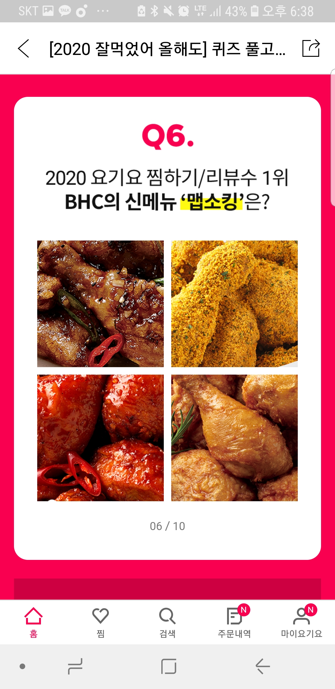 6번입니다. BHC를 자주 시켜먹지 않아요 사실... 그래서 '맵소킹'이라길래 딱 봐도 매워 보이는 이미지를 선택했는데 맞았네요. '빨간 치킨' 이미지가 정답!
