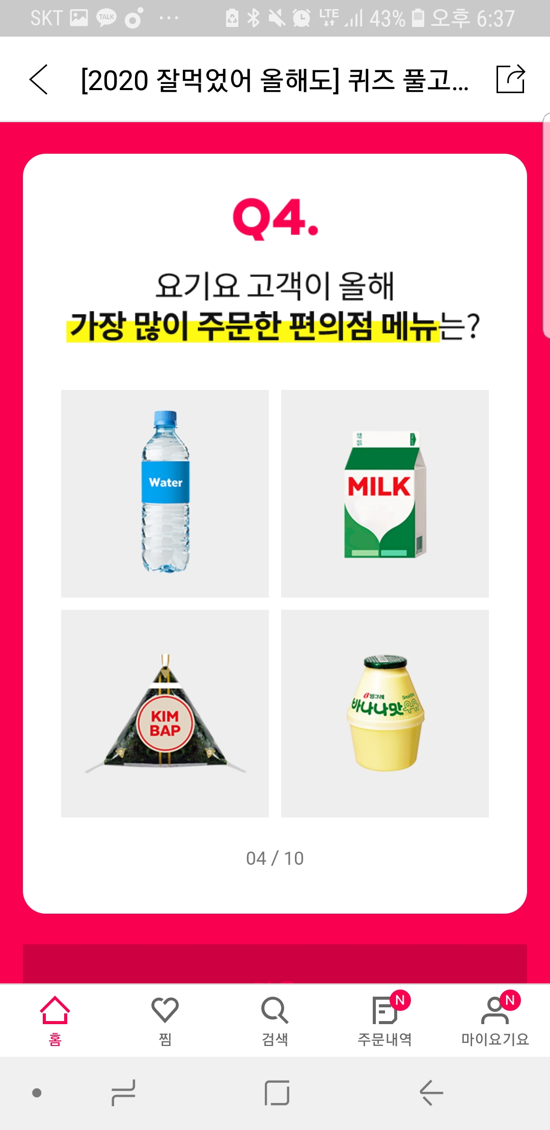4번 문제는 편의점 주문 메뉴 문제였는데요. 저는 제가 좋아하기도 하고, 나머지 이미지가 그래픽 이미지같이 인위적인 느낌인데 반해, 바나나우유만 실사에 가까운 이미지여서 빙그레 '바나나맛 우유'를 골랐는데요. 정답이었습니다!