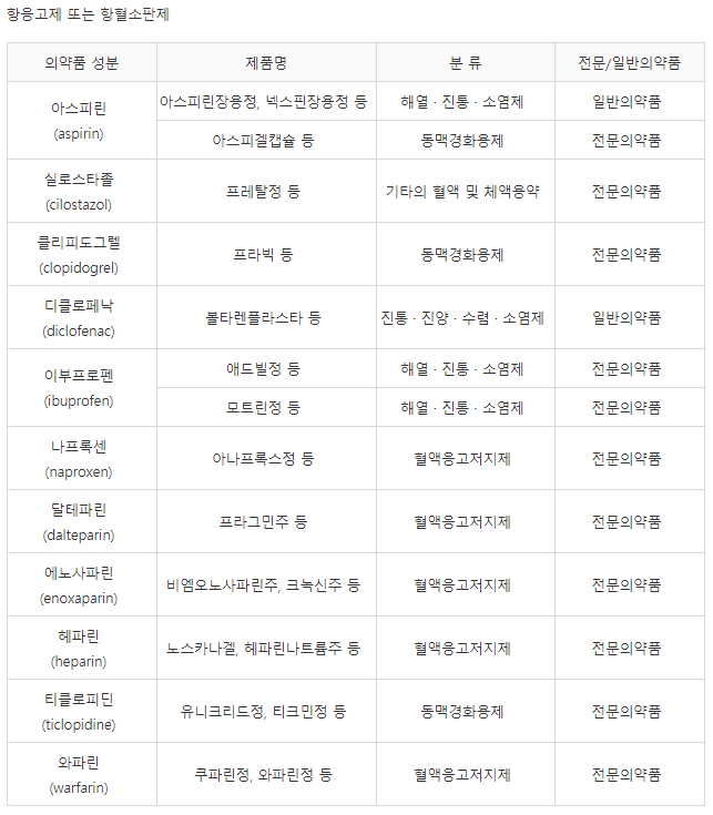 위 표는 혈액의 응고를 지연시키는 의약품인 '항응고제'와 '항혈소판제'를 나타내는데, 수술, 시술 시에 스피루리나를 평소 복용하고 있었다면 의사에게 꼭 말씀해주셔야 합니다. 출혈을 증가시킬 수 있기 때문입니다. 마찬가지로 면역력 증가에 효과가 있기 때문에 면역억제제를 드시게 된다면 전문의와 상담이 필요합니다.