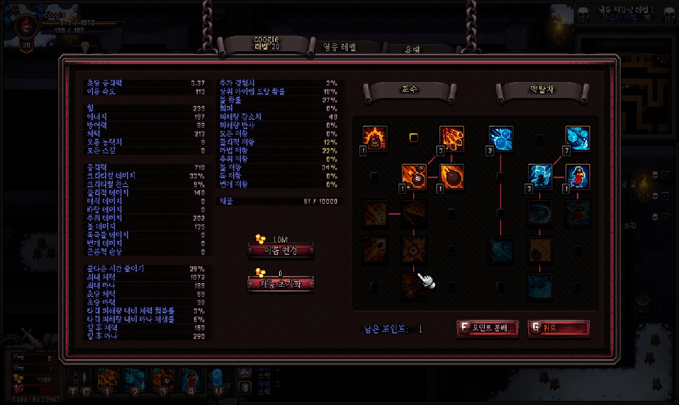 캐릭터의 기본 스텟은 임의로 찍을 수 없지만 '재능'이라는 이름으로 '스킬'을 배울 수 있습니다.