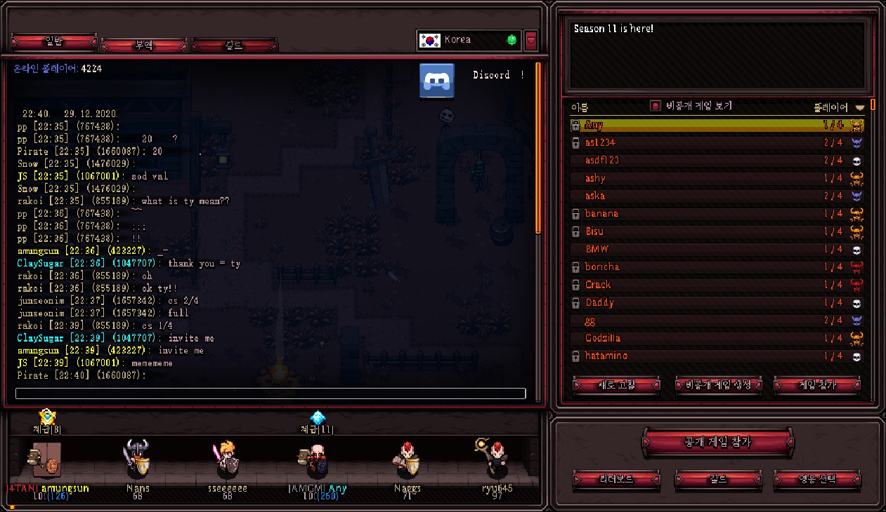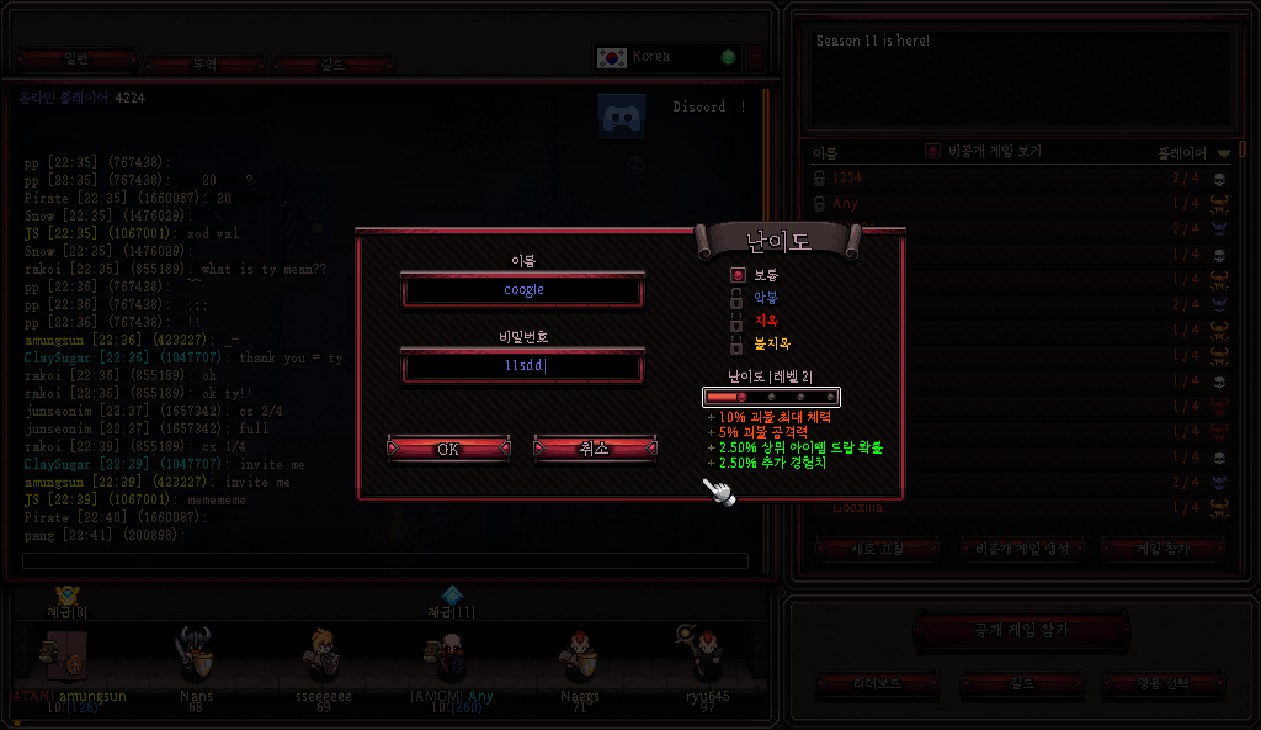 계정은 간단하게 만들수 있습니다. 서버에 접속하면 다른 사람이 만든 공개방에 참가할 수도 있고, 본인이 비공개로 방을 만들어서 플레이할 수도 있습니다.